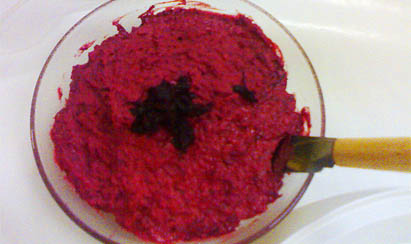 Rallar finamente la remolacha, mezclar bien con la base del paté y dejar enfriar en la nevera antes de servir.